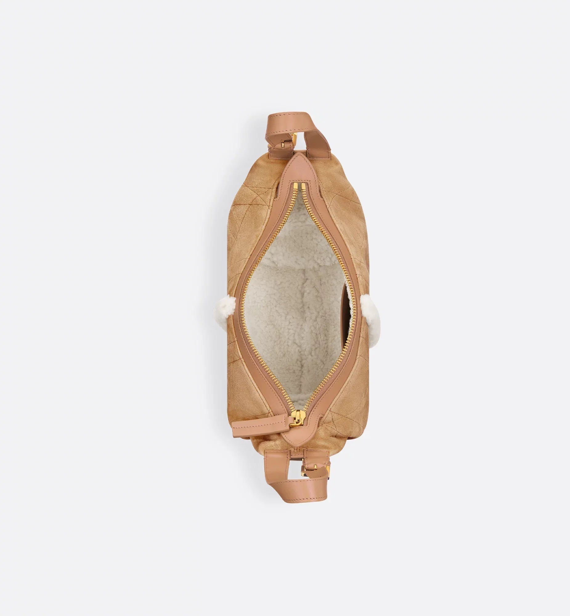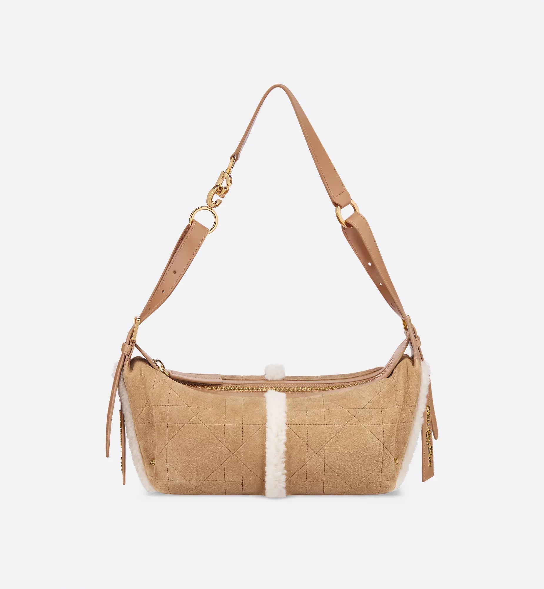 Part of the DiorAlps capsule, the D-Journey bag reimagines the hobo silhouette in a modern supple design. Demonstrating the House’s exceptional savoir-faire, the style is crafted in beige suede lambskin with Macrocannage topstitching, paired with ecru merino wool. The main compartment is completed by a zip pocket, while two decorative side pockets showcase a large leather pull with the Christian Dior Paris signature. Featuring adjustable top handles and a leather strap, the small D-Journey bag can be carried by hand, worn over the shoulder or crossbody as a daily companion, coordinating well with other DiorAlps creations.
