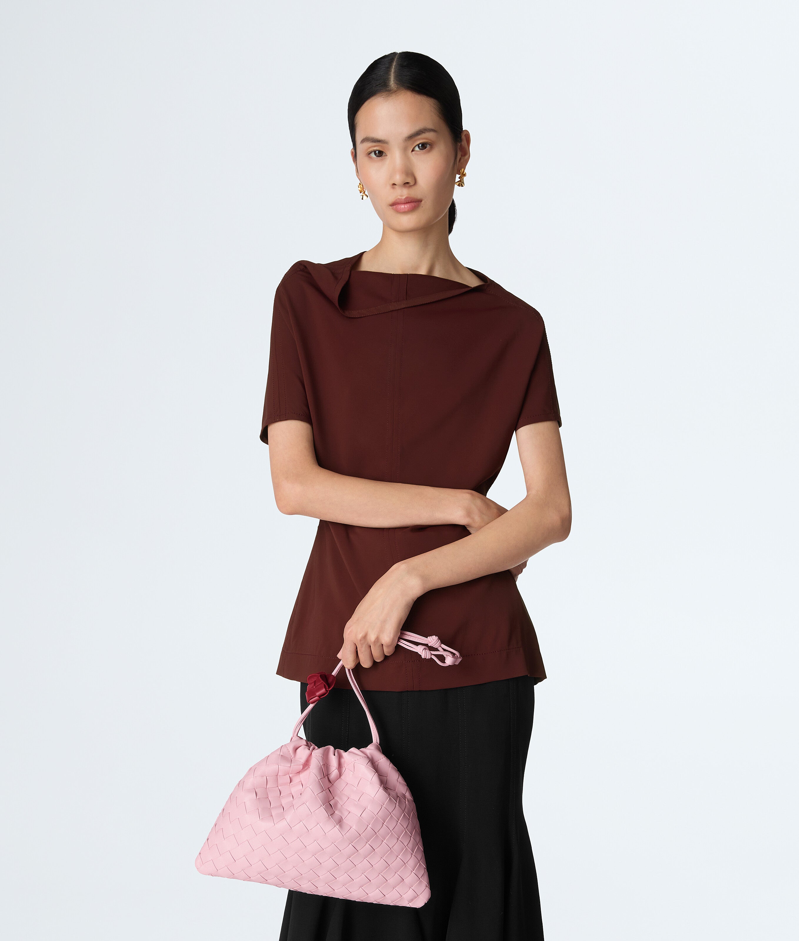 Dustbag in Intrecciato calf leather with detachable heart charm. Features a drawstring closure and loop attachment for shoulder carry.