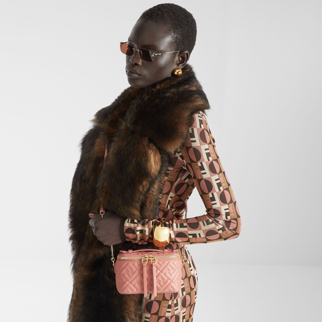 Compact and structured Fendi Vanity bag, featuring a double-slider zip closure embellished with FF details and a leather zip pull.