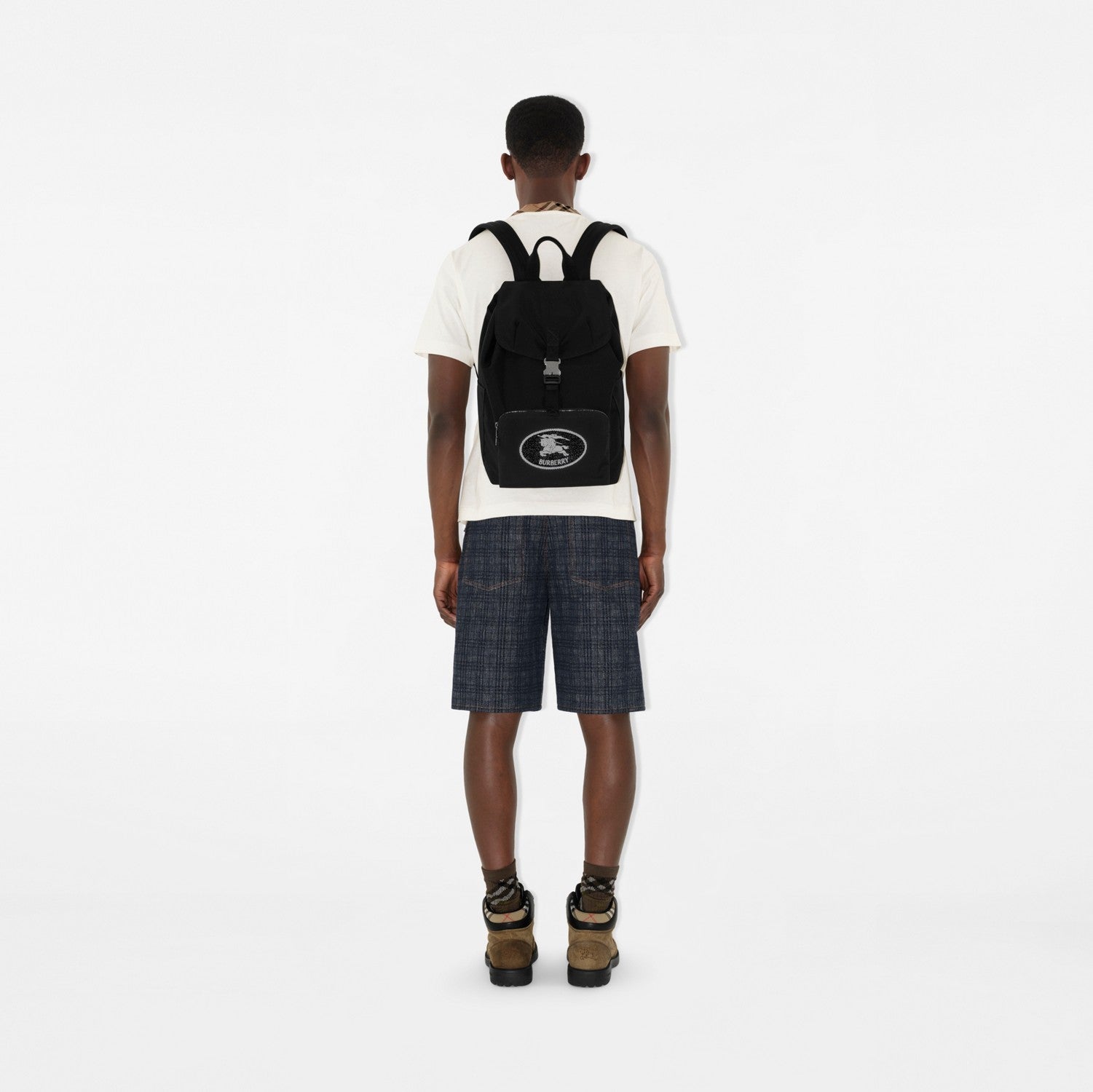 A backpack woven in Italy with a fil coupé Knight stamp in a reflective yarn, lined in a matching colour. The archival motif was first seen on Burberry bags in the 1980s. The clip closure is engraved with our logo and B-cut zip pulls secure the pockets.
