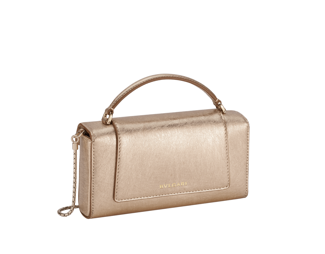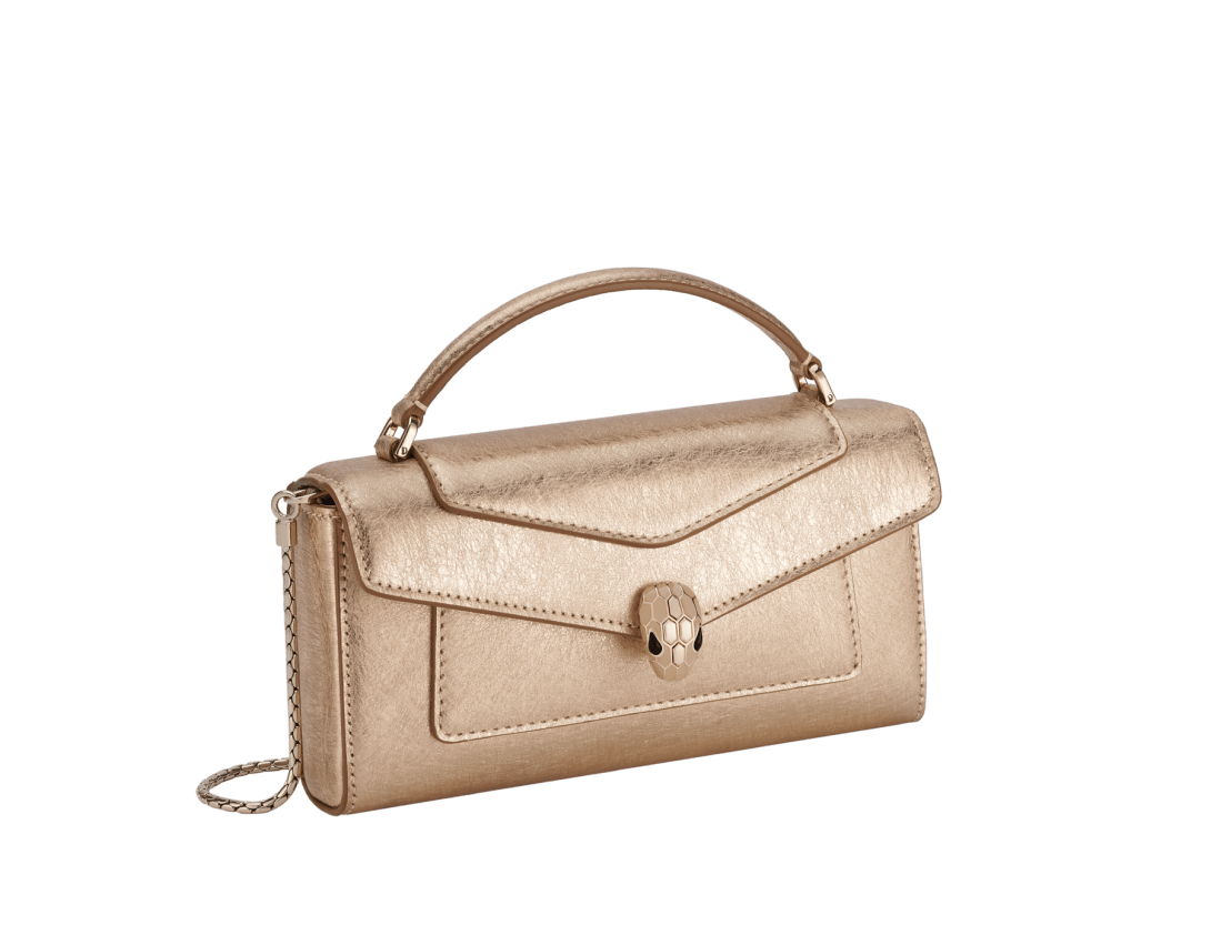 A functional shape with an ultra-contemporary and urban appeal, the Serpenti Forever phone case is crafted in light gold striated calf leather with linen agate nappa leather lining. Designed to be worn by both men and women, the versatile creation is topped by the iconic snakehead magnetic closure, whose hypnotic coloured scales and design draw from the Serpenti jewels of the 60s. Featuring a single compartment, the model is completed by a top handle, a chain strap and a single card slot. 19 x 10 x 3.5 cm – 7.5 x 3.9 x 1.4 inches. Made in Italy.