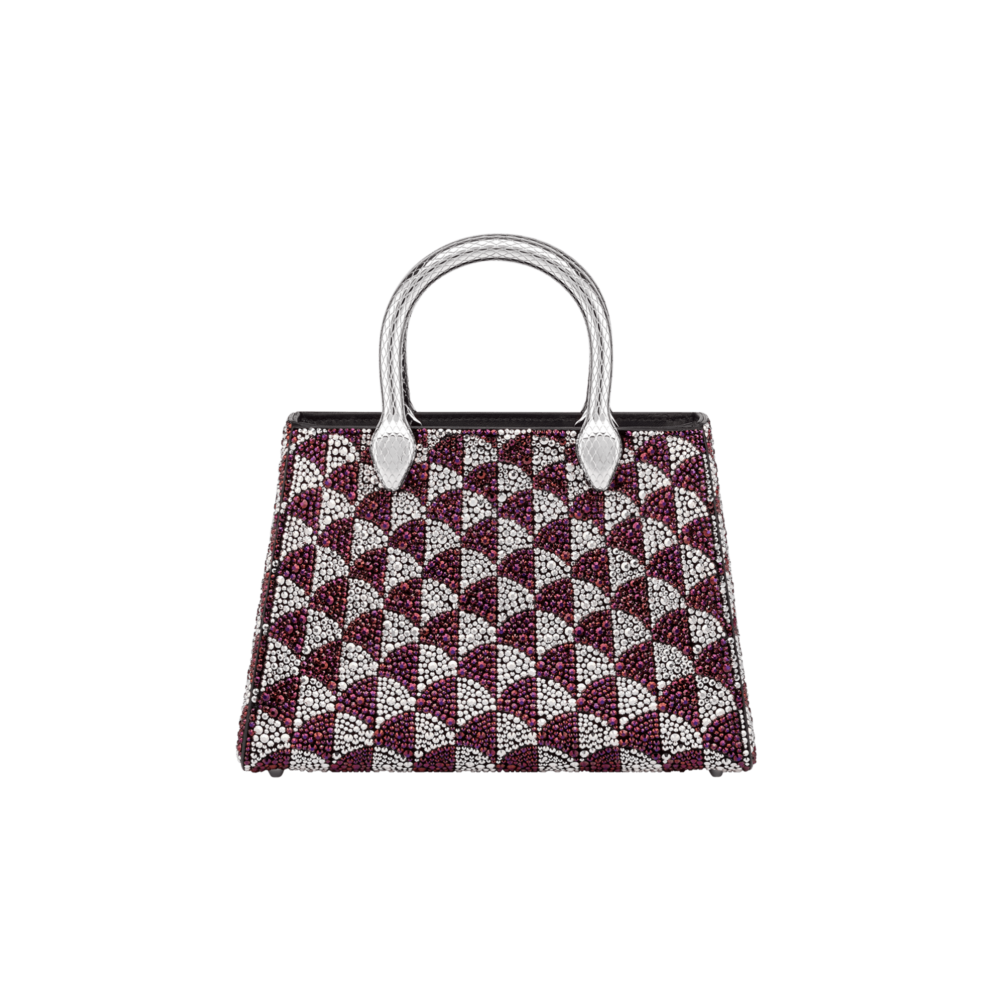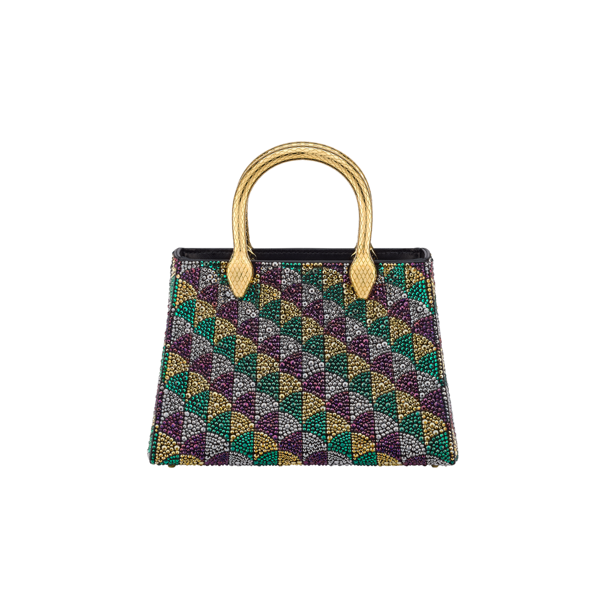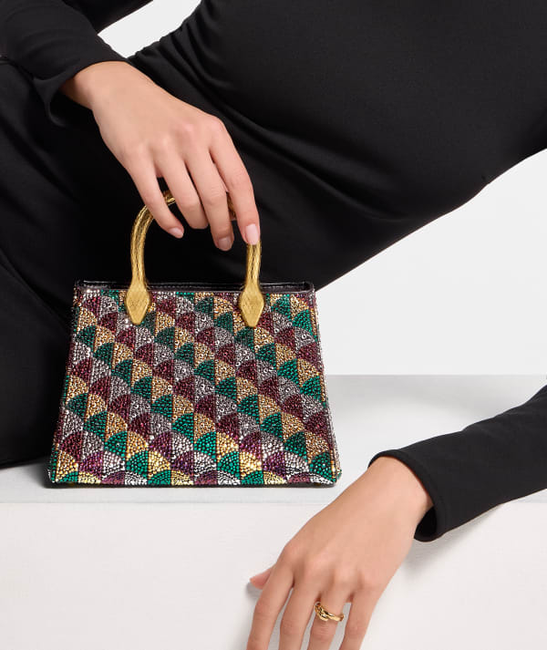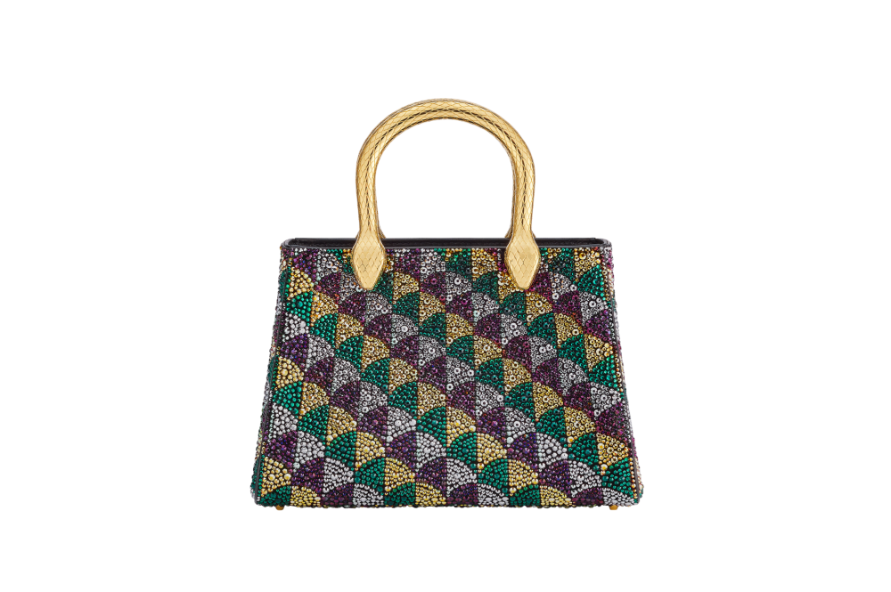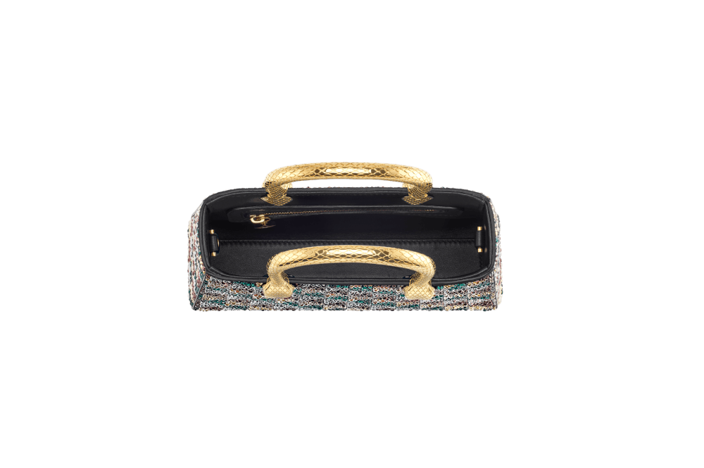 Serpentine Duo tote bag in multicolour Calla Crystals pattern on suede and black nappa leather lining. Captivating double-head snake body-shaped handles in gold-plated brass embellished with engraved scales.